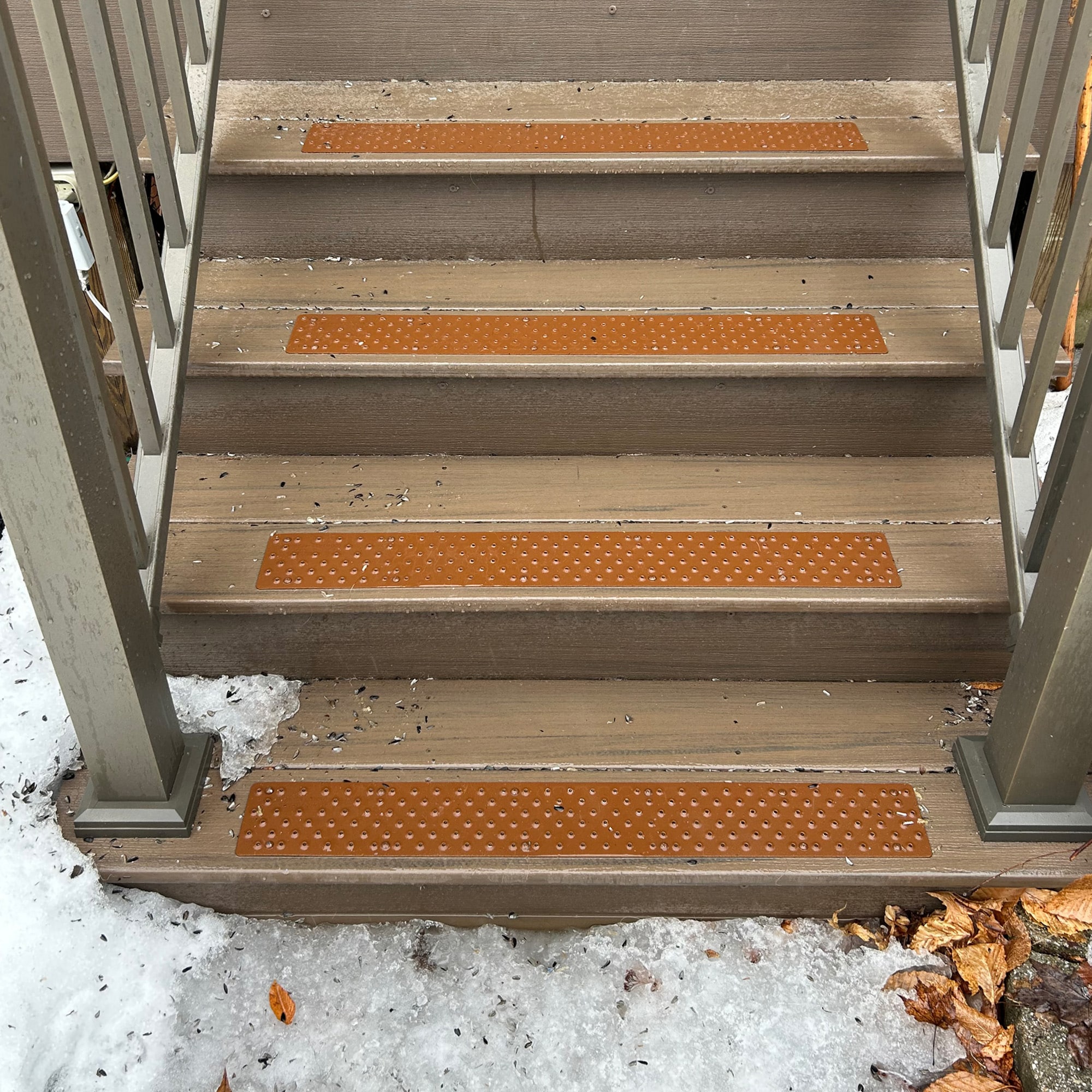 The patented raised-button surface of HandiTreads grips the sole of your shoe or foot, providing instant traction in the way that grit tape, grit paints, snow mats, and other fall prevention products cannot. HandiTreads are also designed to enhance the architecture of your home, not conceal it like many other anti-slip products. No matter the weather or environmental conditions, HandiTreads’ unique self-cleaning design maximizes the amount of slip, trip, and fall prevention in any location, and continues to provide traction up to 1 inch of snow.Â