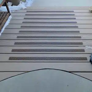 Installation of the aluminum Handi-Treads Deck Treads is very simple on composite wood. They take minutes to install with the simplest of tools. Once installed no maintenance is required for the Handi-Treads Disk Treads which are guaranteed to last a lifetime.